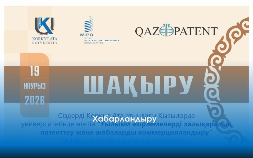 Қайырлы күн, әріптестер! ХАБАРЛАНДЫРУ!!! Сіздерді "Қорқыт Ата атындағы Қызылорда университеті" КеАҚ, ҰЗМИ "Қазпатент" және "Ғылым қоры" АҚ бірлесіп өткізетін «Ғылыми әзірлемелерді халықаралық патенттеу және жобаларды коммерцияландыру» тақырыбындағы онлайн семинарға қатысуға шақырамыз.