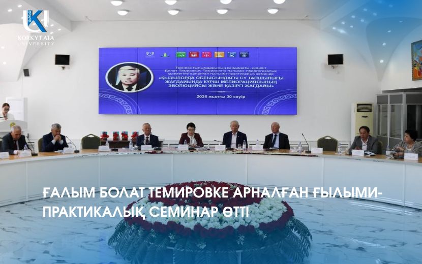 Қорқыт ата атындағы Қызылорда университетінде техника ғылымдарының кандидаты, доцент Болат Темировтің ғылыми-педагогикалық қызметіне арналған «Қызылорда облысындағы су тапшылығы жағдайында күріш мелиорациясының эволюциясы және қазіргі жағдай» тақырыбында ғылыми-практикалық семинар өтті.